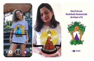 In 2021 we created the First Phygital T-shirt in Brazil, using AR from Spark AR on Instagram. This T-shirt celebrates the Círio de Nazareth, the biggest Brazilian Religion Festival in the Amazonian City of Belém, every year for over 2 Centuries. As the world was leaving behind the Pandemic, the possibility of sharing using social media became very popular among the local people.